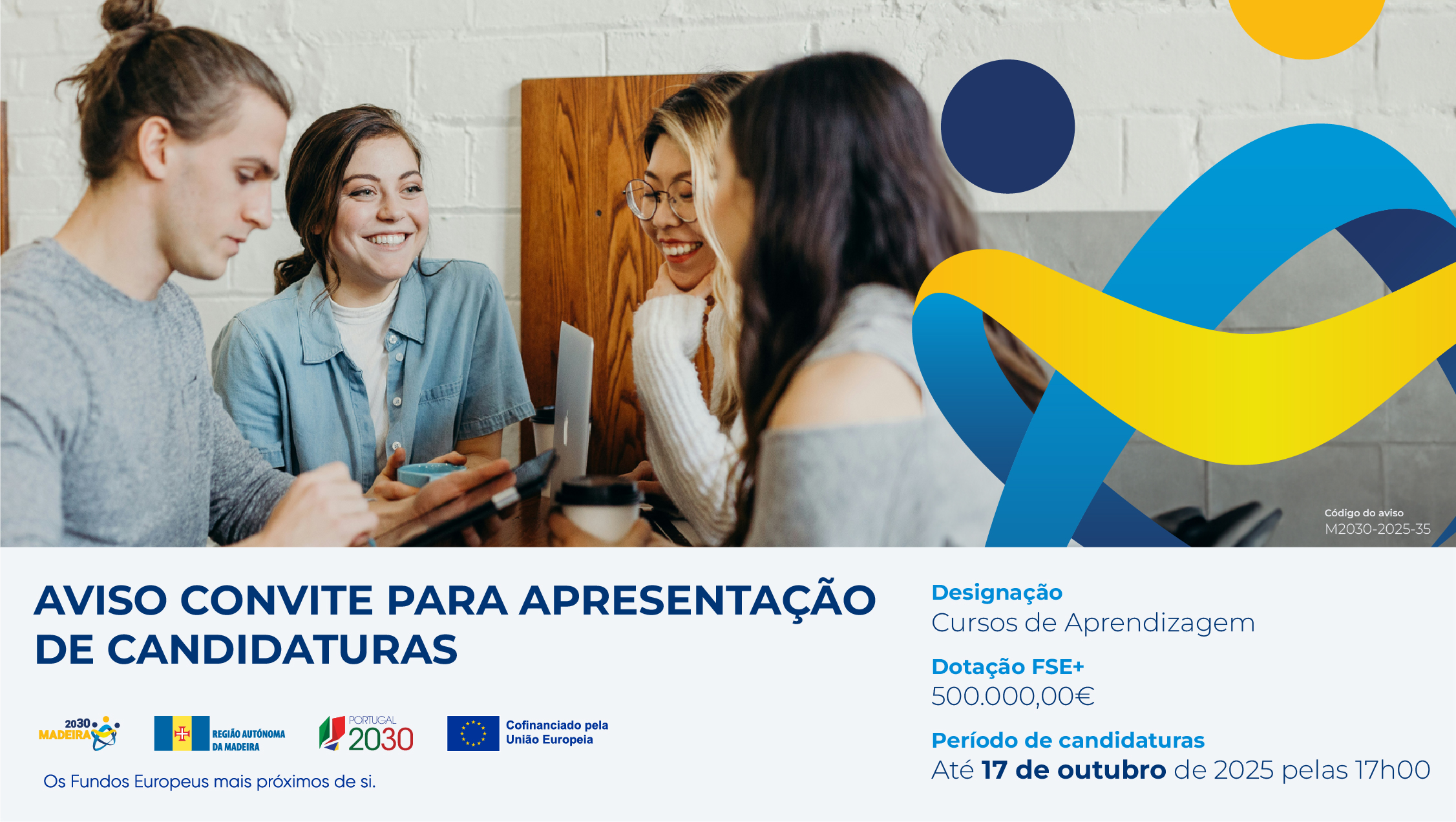 Foi publicado o Aviso-Convite M2030-2025-35 – Cursos de Aprendizagem, no âmbito do Programa Madeira 2030, destinado a apoiar percursos de qualificação de jovens e adultos até 29 anos, com o 9.º ano de escolaridade ou habilitação equivalente.