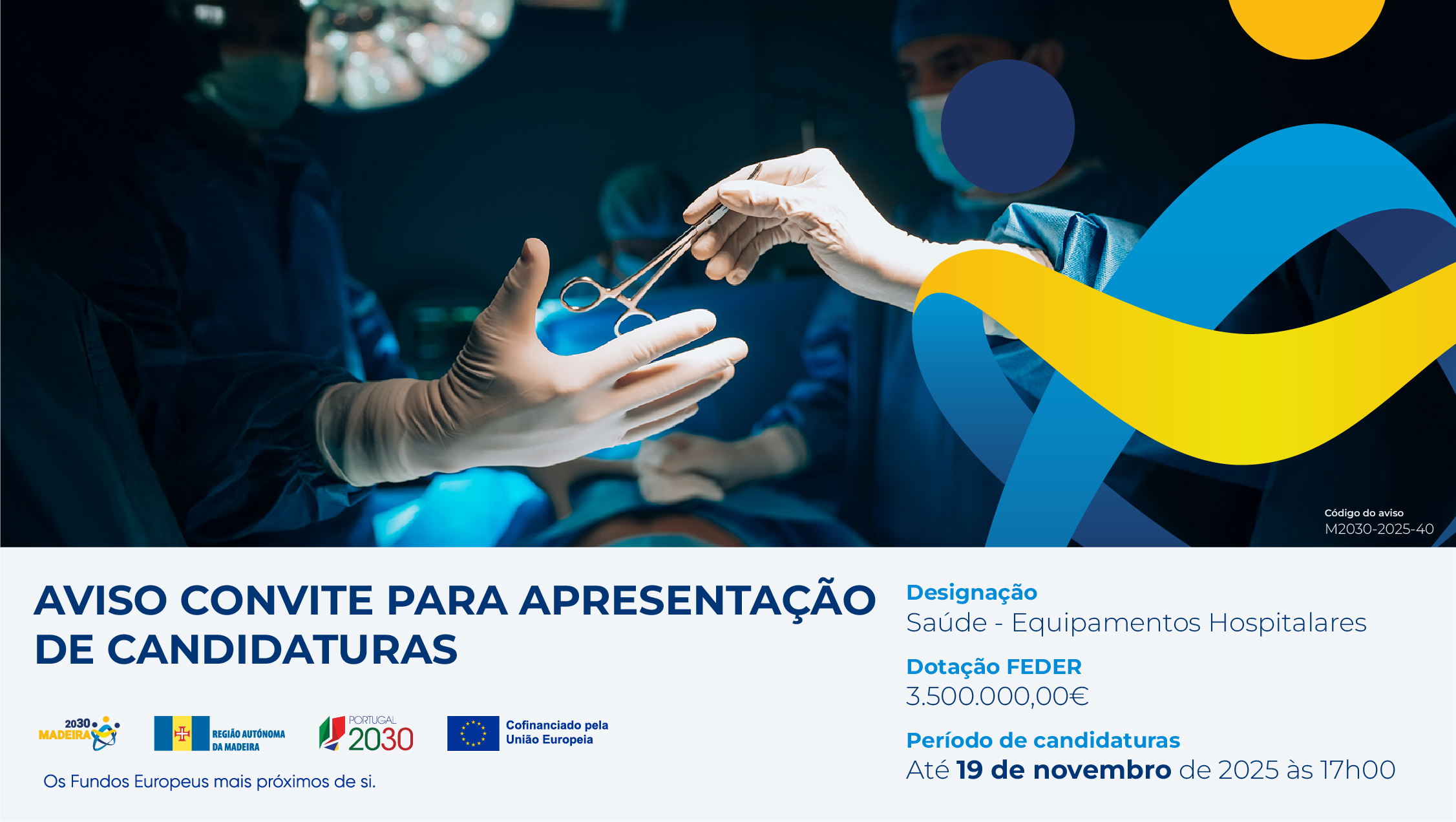 Foi publicado o Aviso-Convite M2030-2025-40 – Saúde: Equipamentos Hospitalares, no âmbito do Programa Madeira 2030, destinado a reforçar a capacidade de diagnóstico e tratamento das unidades hospitalares da Região Autónoma da Madeira, através da aquisição de equipamentos médicos tecnologicamente avançados.