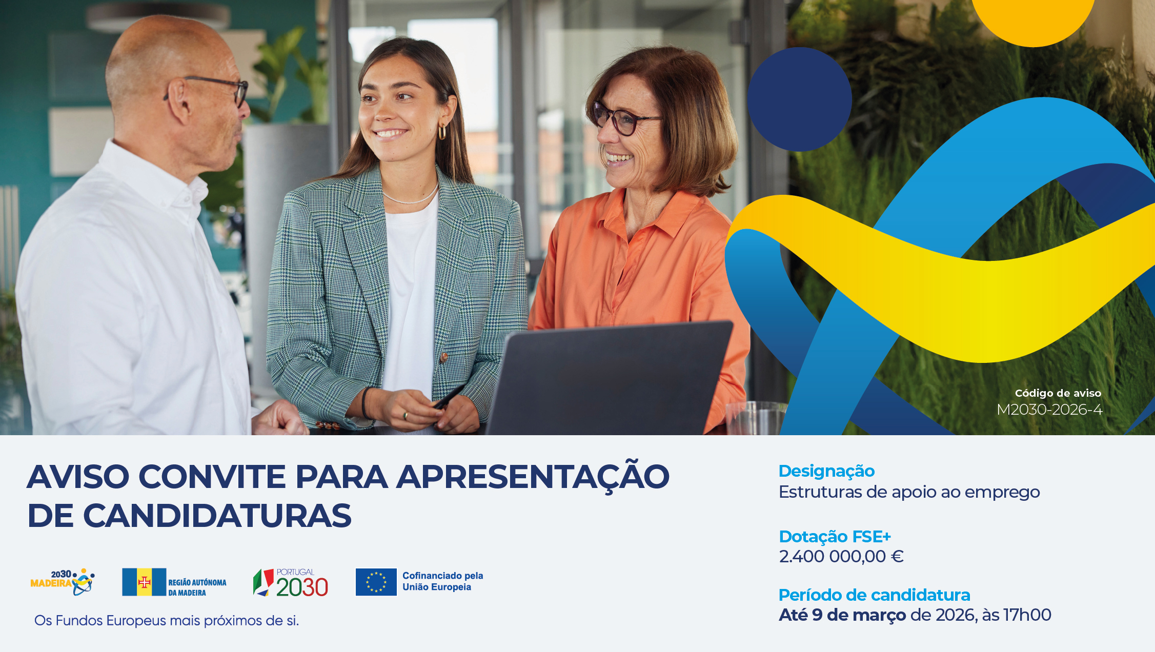O aviso enquadra-se na prioridade Madeira + Social e Inclusiva, no Objetivo Específico ESO 4.1 – Melhorar o acesso ao emprego, e dispõe de uma dotação de 2,4 milhões de euros do Fundo Social Europeu Mais (FSE+).
