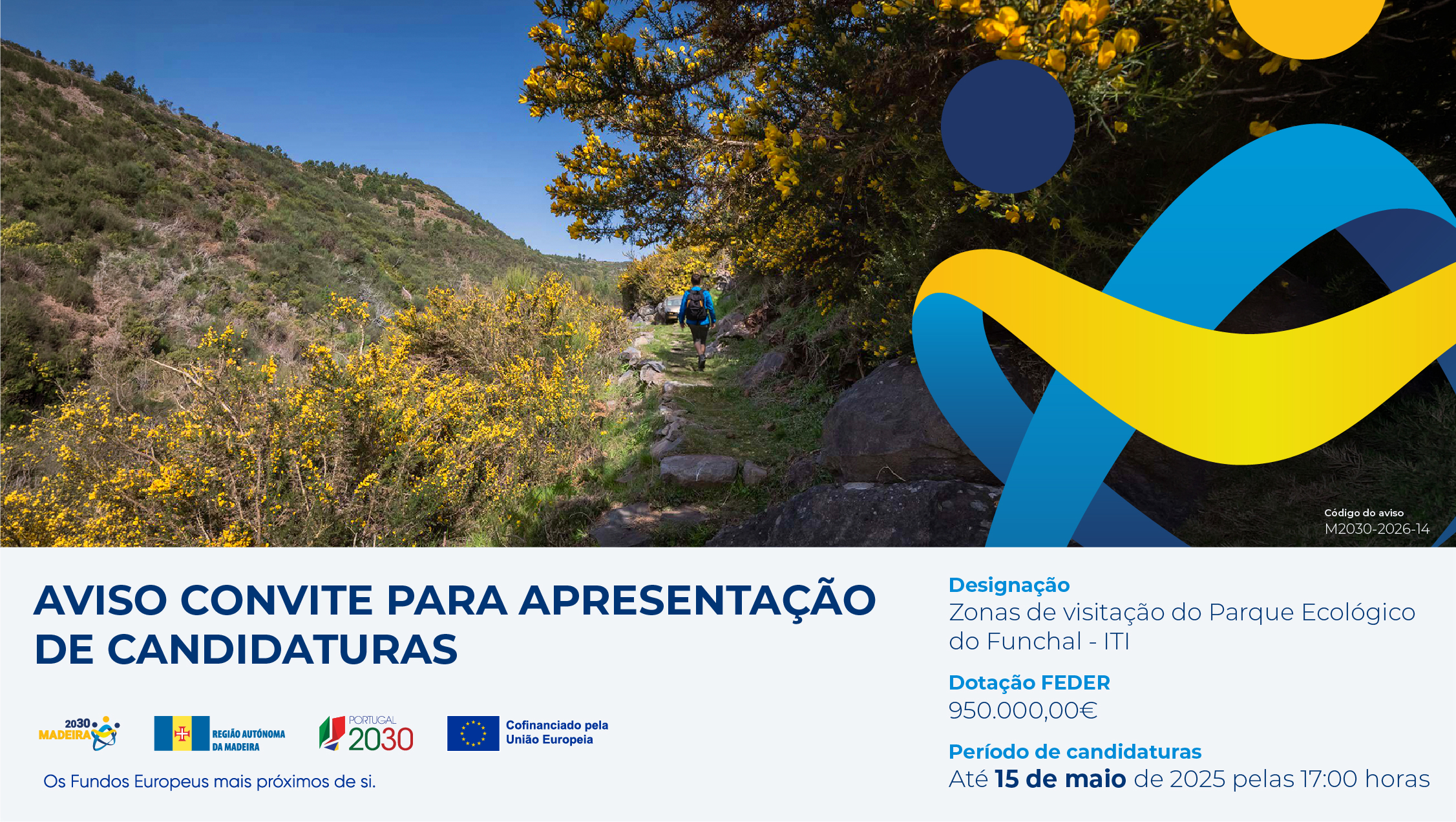 Foi publicado o Aviso para apresentação de candidaturas por convite M2030-2026-14 – Zonas de visitação do Parque Ecológico do Funchal – ITI, no âmbito do Programa Regional da Madeira 2021-2027. O aviso enquadra-se na prioridade “Madeira + Verde: Ação Climática e Transição Energética” e no objetivo específico RSO2.7 – Proteção da natureza e biodiversidade, visando […]